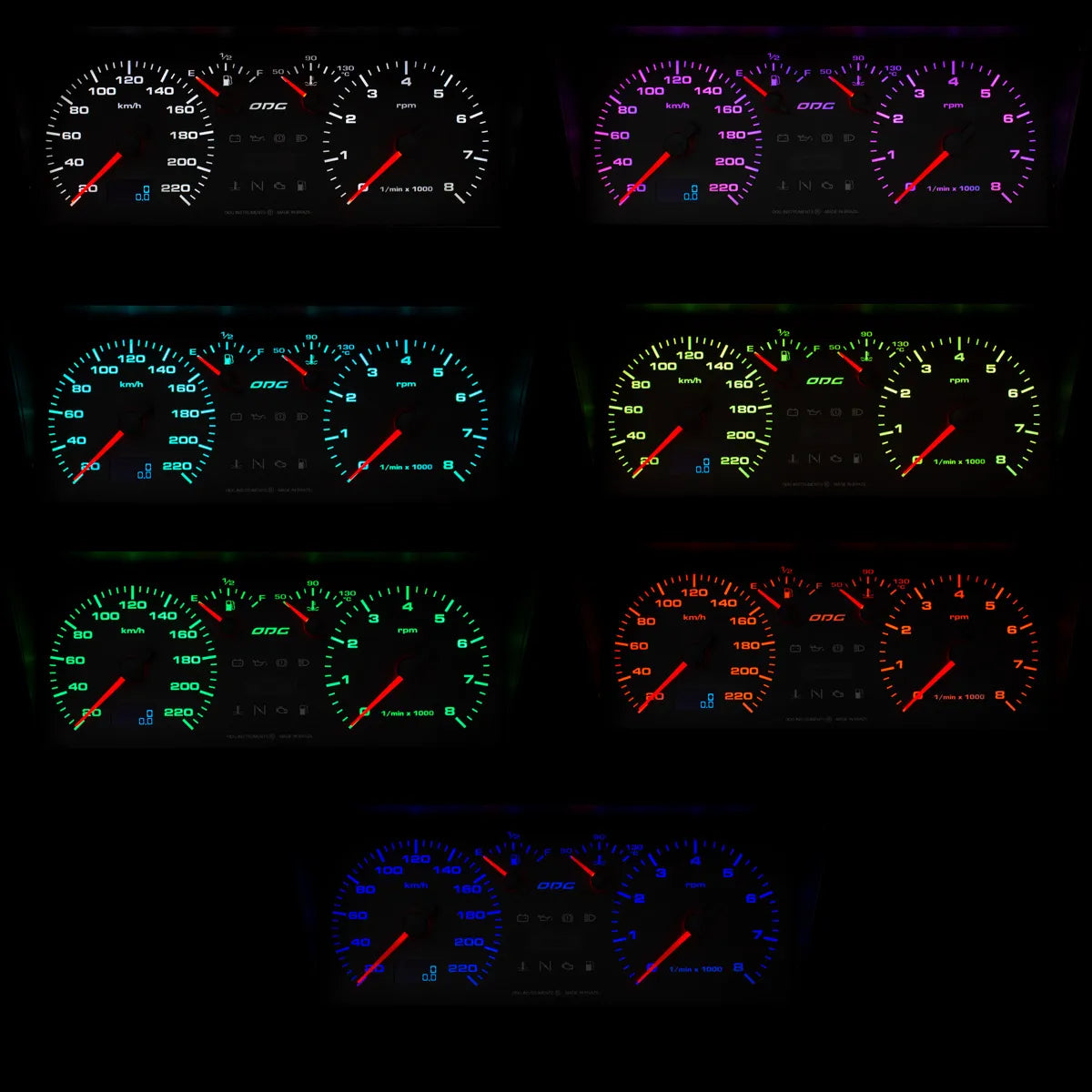 Model VW Golf MK1 / MK2: with white lettering, multicolor translucent lighting, and red illuminated pointer (8000 RPM and 200 km/h).